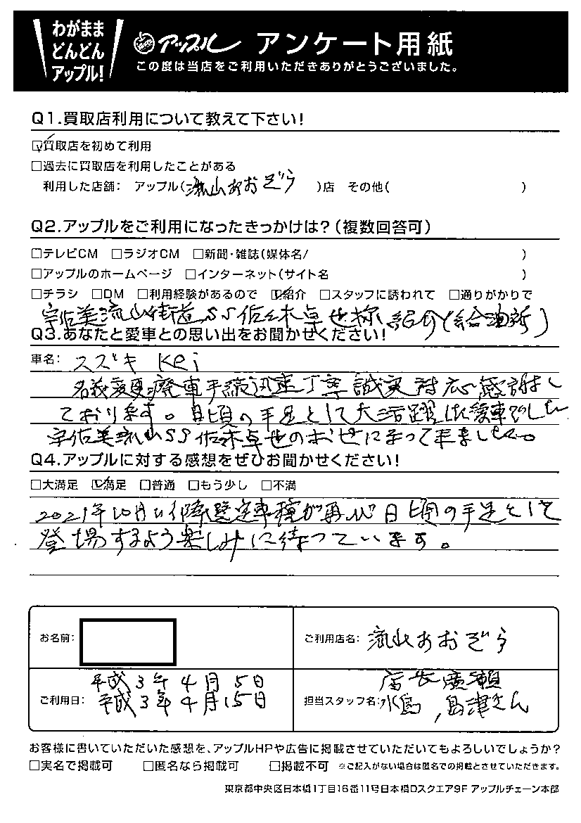 名義変更廃車手続き迅速丁寧誠実対応感謝しております。日頃の手足として大活躍した愛車でした。宇佐美流山SS佐々木卓也さまのお世話になって来ました。