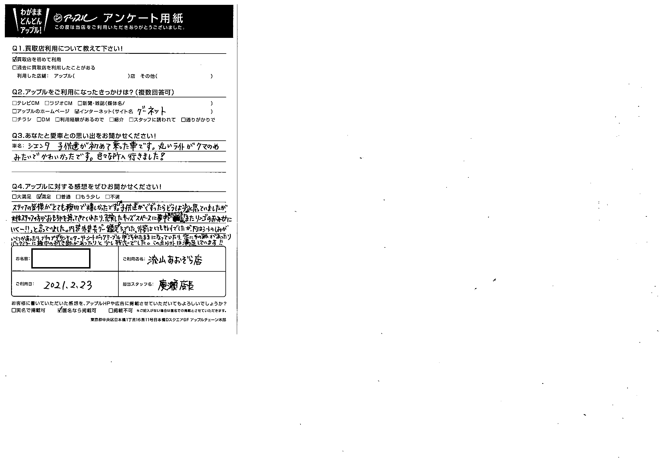 スタッフの皆様がとても親切で嬉しかったです。「子供たちがぐずったらどうしよう」と思っていましたが、女性スタッフの方がおもちゃを持ってきてくれたり、充実したキッズスペースに夢中で助かりました。「またリンゴのおみせにいくー!!」と言っていました。内装外装ともグー鑑定「5」でした。外装はとてもキレイでしたが、内はシートのしみがいくつかあったりフリップダウンモニターやシートバックテーブルが汚れたままになっていたり窓に手の跡があったりバックミラーに雑巾の拭き跡があったりと少し残念でした。この点以外は満足しています!!