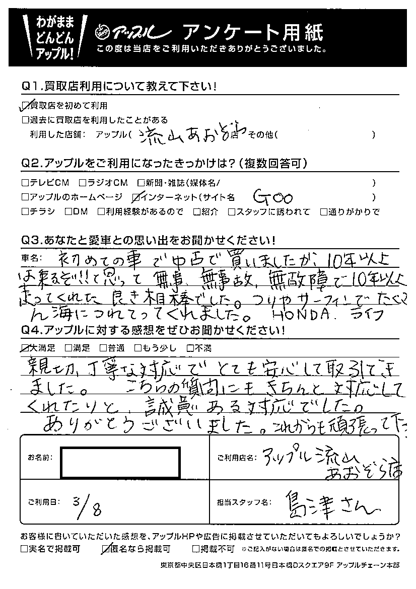 初めての車で中古で買いましたが、10年以上は乗るぞ!!と思って無事、無事故、無故障で10年以上走ってくれた良き相棒でした。つりやサーフィンで沢山海につれてってくれました。