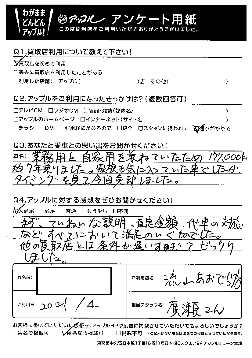 業務用と自家用を兼ねていたため177,000km約7年乗りました。