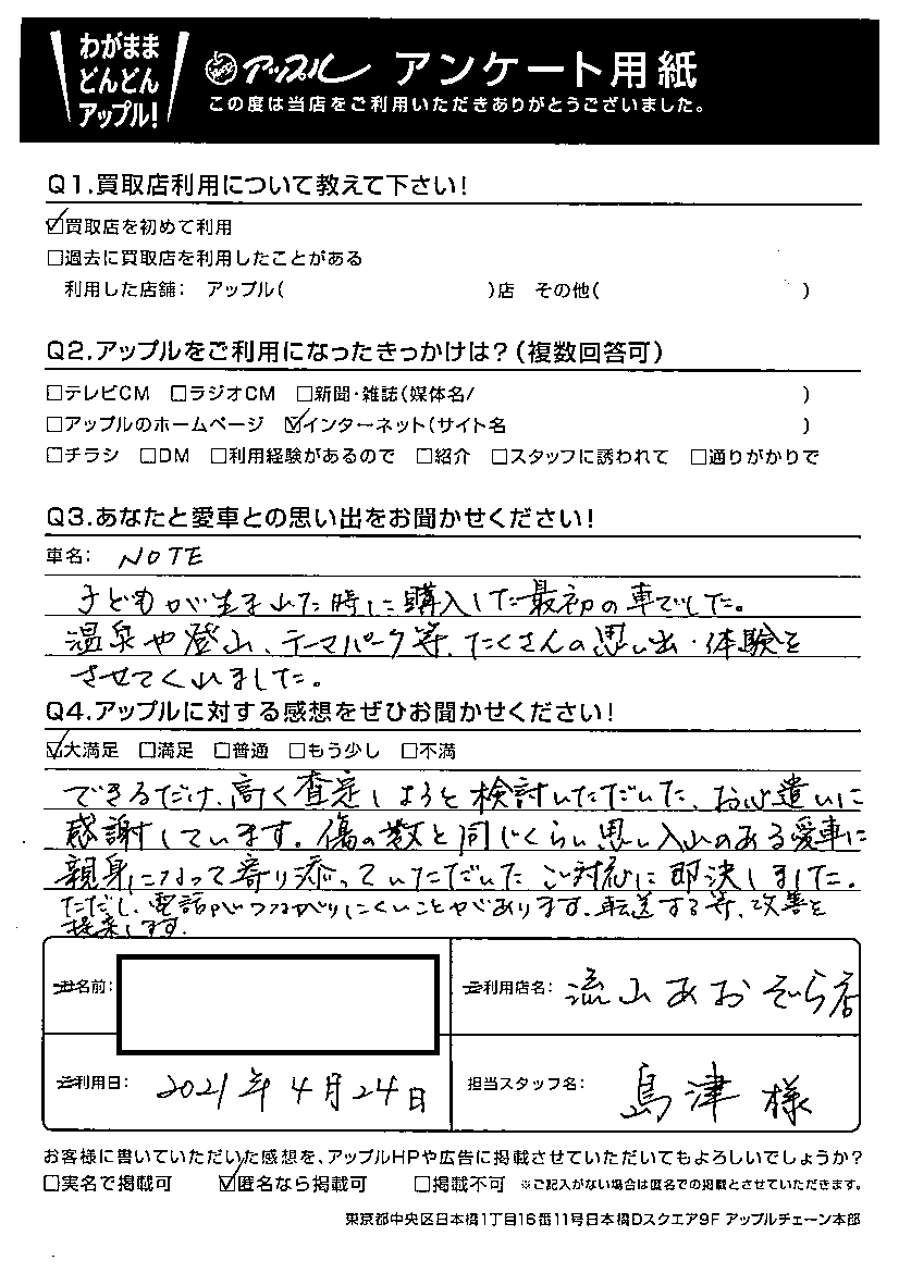 できるだけ高く査定しようと検討いただいたお心遣いに感謝しています。傷の数と同じくらい思い入れのある愛車に親身になって寄り添っていただいたご対応に即決しました。