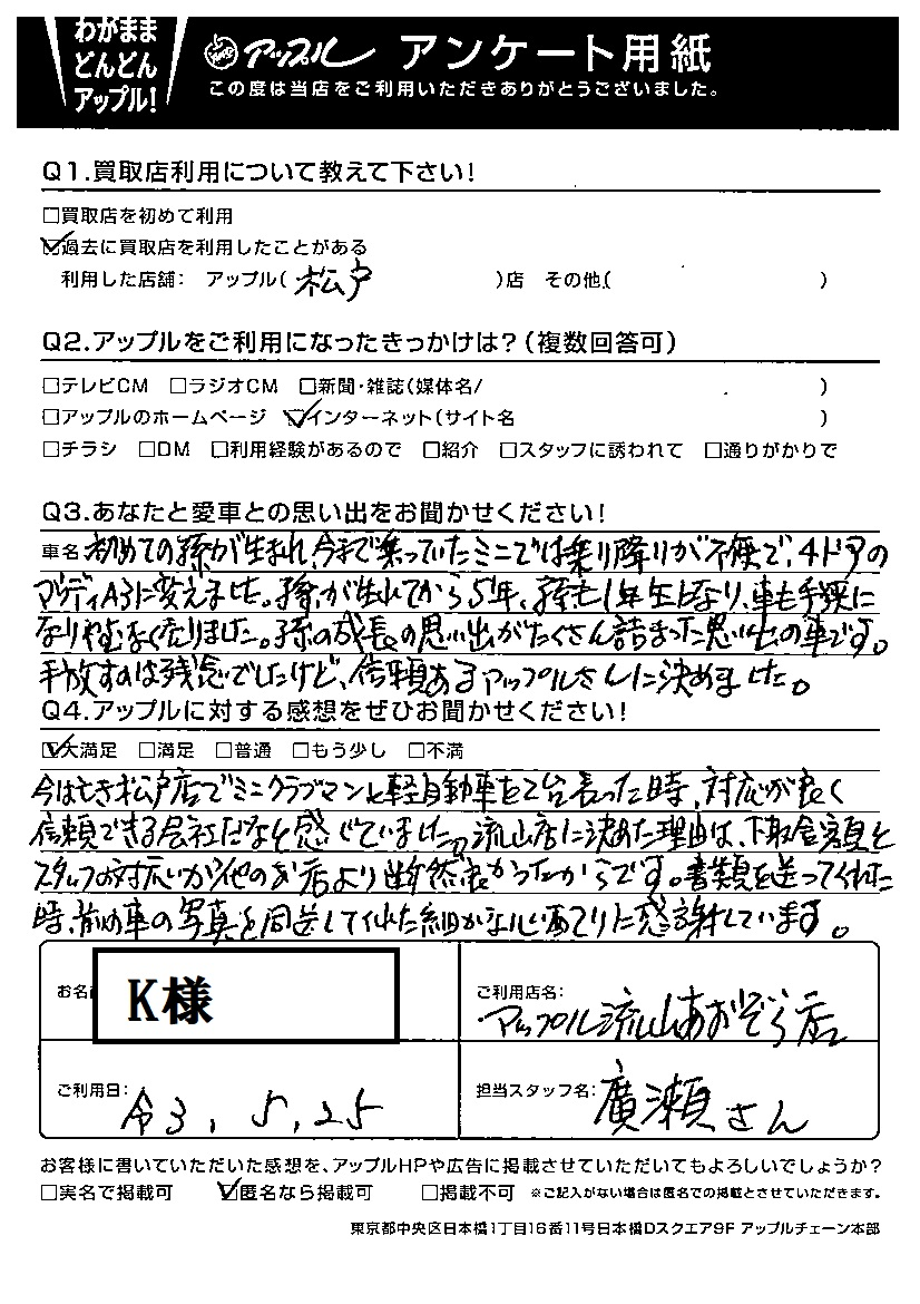 初めての孫が生まれ、今まで乗っていたミニでは乗り降りが不便で4ドアのアウディA3に変えました。孫が生まれてから5年、孫も1年生になり車も手狭になりやむなく変えました。孫の成長の思い出がたくさん詰まった思い出の車です。手放すのは残念でしたけど、信頼あるアップルさんに決めました。