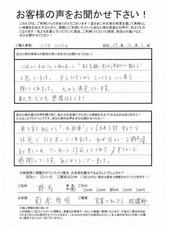 車を見た知人から「これ新車?」と言われる程キレイな状態で引き渡してくれました。私が住んでいる群馬県まで来てくれていねいに対応してくれた久木さんにも感謝しています。ありがとうございました。」