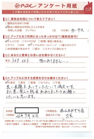 M様、このたびは当店にお任せいただきましてありがとうございました!M様と同様に大切にイストに乗っていただける次のオーナー様を必ずお探しいたします!ありがとうございました! by久木
