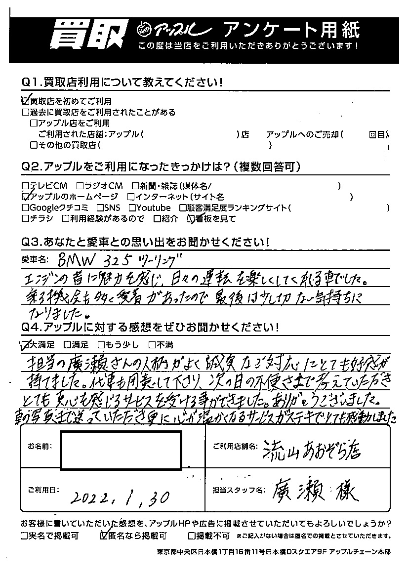 担当の広瀬さんの人柄がよく誠実なご対応にとても好感がもてました。代車も用意してくださり、次の日の不便さまで考えていただきとても真心を感じるサービスを受けることができました。ありがとうございました。