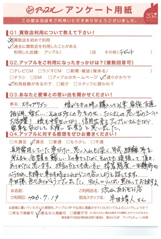 長年愛用していたクルマだけに、思い入れも深く、年式・距離等を考えると、金額も難しいとの事でしたが、それでも頑張って頂き、ありがたく思います。担当の方、とても良い方で、接客態度、一生件名さに心打たれ、夫婦でだす時はこれからこの店にしようと話してます。半田様色々とありがとございました。知人にいっぱい宣伝しておきますねネ。