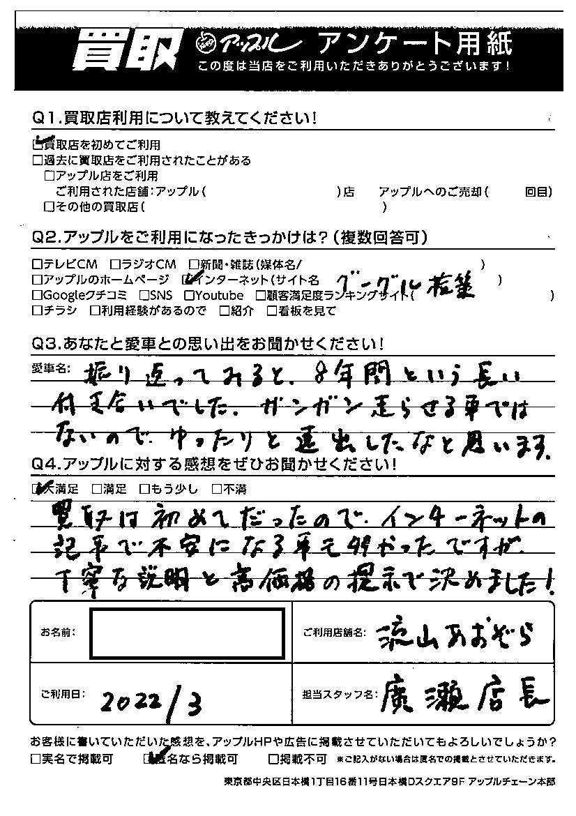 買取は初めてだったのでインターネットの記事で不安になることも多かったですが、丁寧な説明と高価格の提示で決めました!