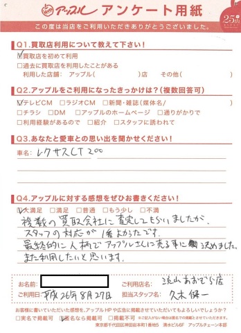 複数の買取会社に査定もらいましたが、スタッフの対応が1番よかったです。最終的に人柄でアップルさんに売る事に決めました。また利用したいと思います。