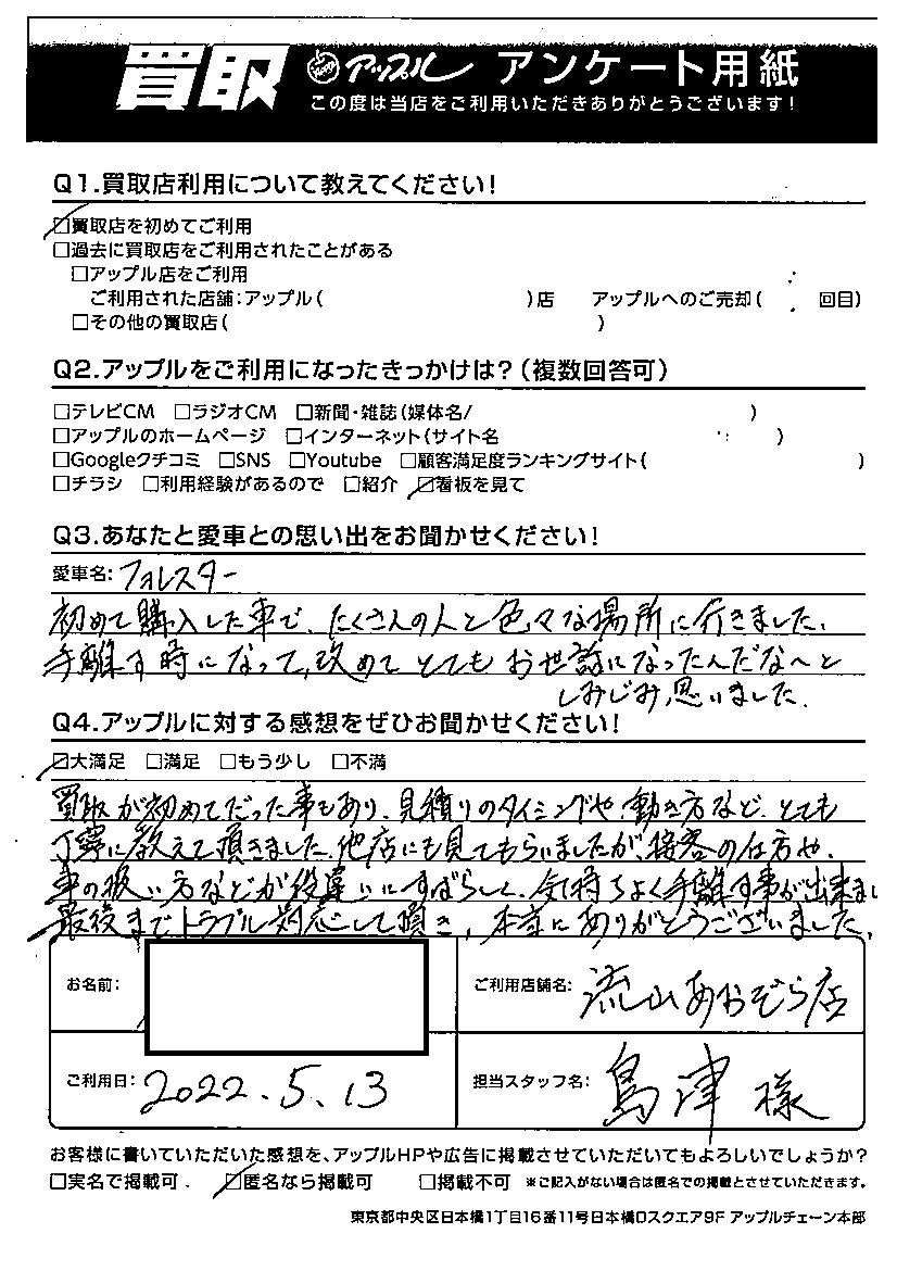 買取が初めてだったこともあり、見積もりのタイミングや動き方など、とても丁寧に教えていただきました。他店にも見てもらいましたが接客の仕方や車の扱い方などが段違いにすばらしく気持ちよく手離すことができました。