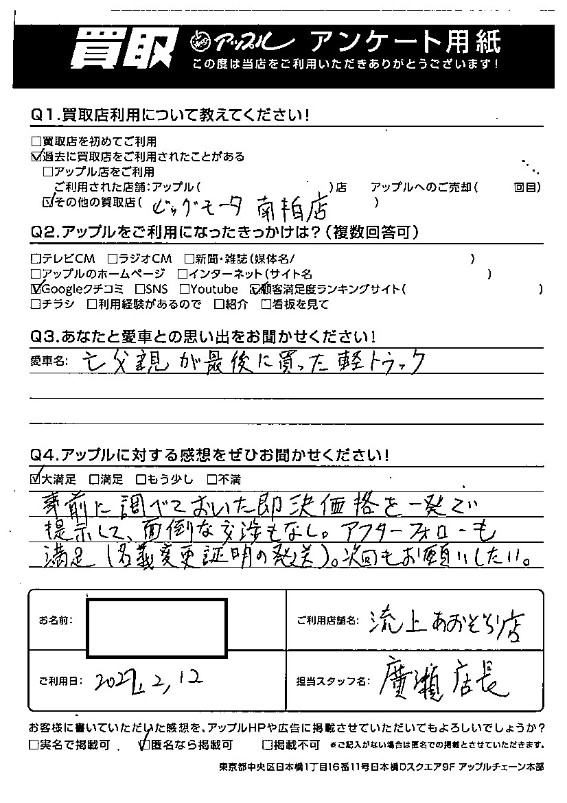 事前に調べておいた即決価格を一発で提示して、面倒な交渉もなし。アフターフォローも満足(名義変更証明の発送)。次回もお願いしたい。