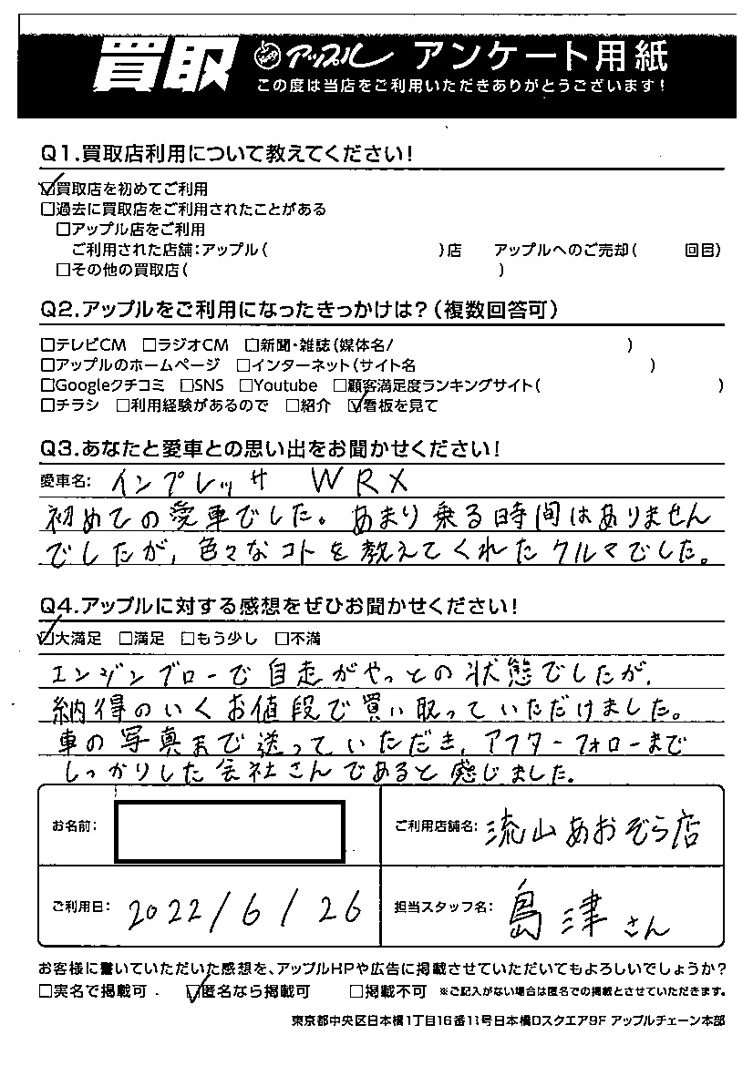 U様 車名:スバル インプレッサセダン