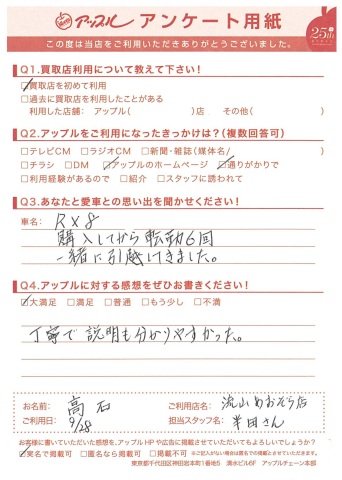 高石様、このたびは当店にお任せいただきありがとうございました!とてもキレイに大切に乗られていたRX-8。高石様と同じように大切に乗っていただける次のオーナー様をしっかりと探しますね!