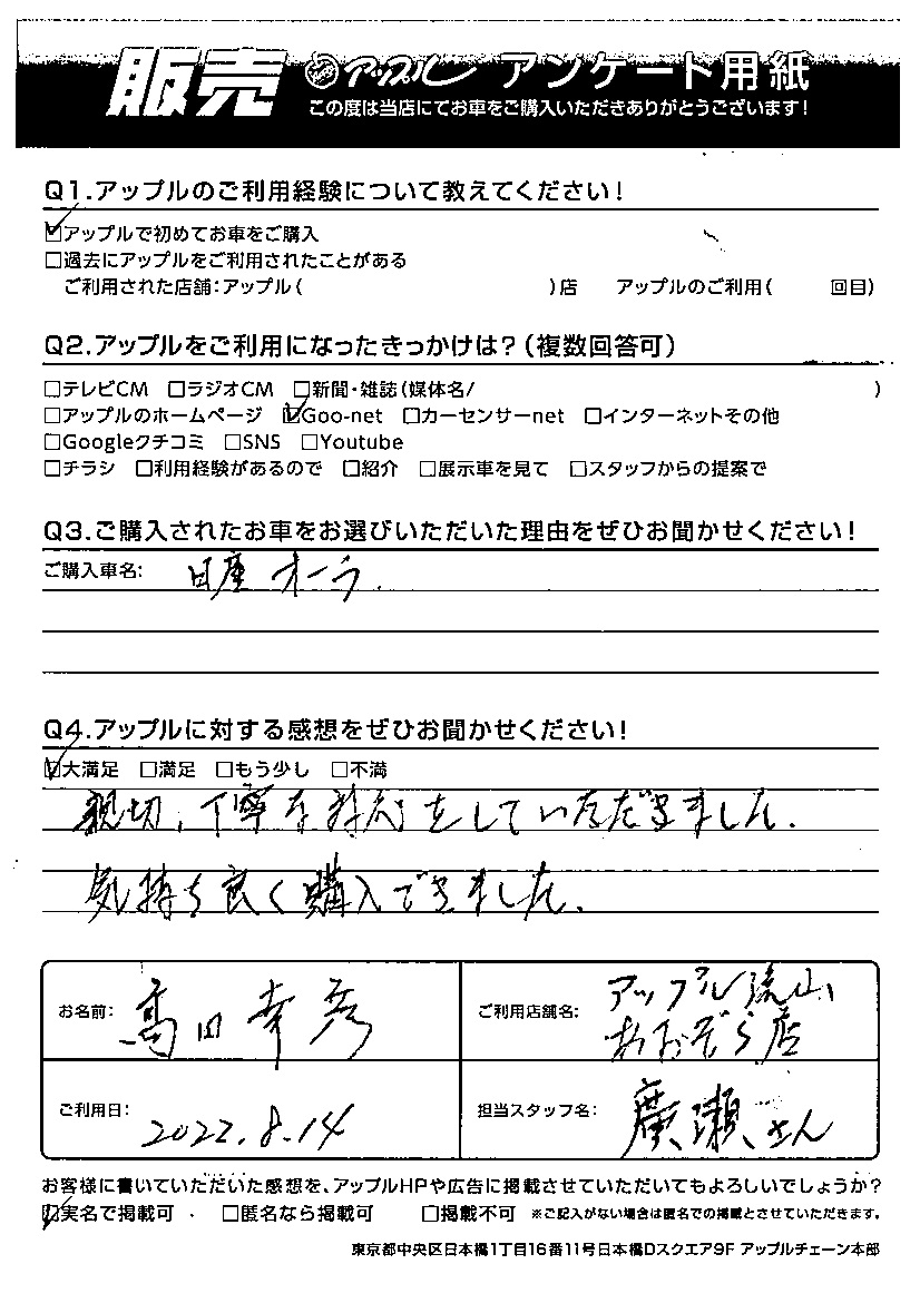 お車のご相談・ 査定だけでもOK! カンタン 入力 30秒 アップルがブランド買取始めました! お電話でも受付中! 受付時間10:00 ~ 18:30 0120-703-903 お車のご相談・ 査定だけでもOK! カンタン 入力 30秒 アップルがブランド買取始めました! お電話でも受付中! 受付時間10:00 ~ 18:30 0120-703-903 アップルがブランド買取始めました! お電話でも受付中! 受付時間10:00 ~ 18:30 0120-703-903 店舗情報 在庫車 スタッフ紹介 ブログ お客様の声 キャンペーン お得 無料査定 click お客様の声 ご記入日: 2022/08/14 高田 幸彦様 車名:日産 ノートオーラ Q.アップルに対する感想をぜひお聞かせください!大満足親切・丁寧な対応をしていただきました気持ちよく購入できました。 前へ 次へ お客様の声一覧を見る
