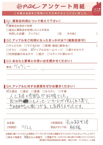 S様、この度は愛車ヴォクシーをお任せいただきまして誠にありがとうございました!S様同様、大切に乗っていただける次のオーナー様をしっかり探しますよ!!ありがとうございました! by半田靖人