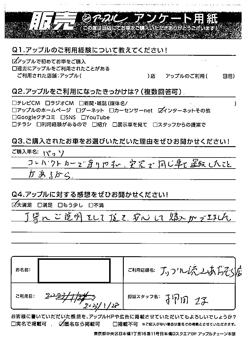 T様 車名:トヨタ パッソ