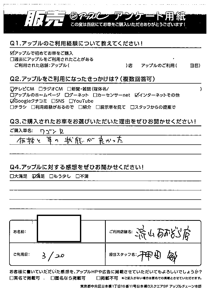 お車のご相談・ 査定だけでもOK! カンタン 入力 30秒 アップルがブランド買取始めました! お電話でも受付中! 受付時間10:00 ~ 18:30 0120-703-903 お車のご相談・ 査定だけでもOK! カンタン 入力 30秒 アップルがブランド買取始めました! お電話でも受付中! 受付時間10:00 ~ 18:30 0120-703-903 アップルがブランド買取始めました! お電話でも受付中! 受付時間10:00 ~ 18:30 0120-703-903 店舗情報 在庫車 スタッフ紹介 ブログ お客様の声 キャンペーン お得 無料査定 click お客様の声 ご記入日: 2023/03/20 T様 車名:スズキ ワゴンR Q.ご購入されたお車をお選びいただいた理由をぜひお聞かせください!価格と車の状態が良かったQ.アップルに対する感想をぜひお聞かせください!満足 前へ 次へ お客様の声一覧を見る