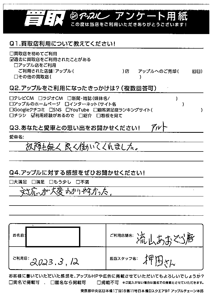 お車のご相談・ 査定だけでもOK! カンタン 入力 30秒 アップルがブランド買取始めました! お電話でも受付中! 受付時間10:00 ~ 18:30 0120-703-903 お車のご相談・ 査定だけでもOK! カンタン 入力 30秒 アップルがブランド買取始めました! お電話でも受付中! 受付時間10:00 ~ 18:30 0120-703-903 アップルがブランド買取始めました! お電話でも受付中! 受付時間10:00 ~ 18:30 0120-703-903 店舗情報 在庫車 スタッフ紹介 ブログ お客様の声 キャンペーン お得 無料査定 click お客様の声 ご記入日: 2023/03/12 S様 車名:スズキ アルト (2015年12月以降のワークス含む) Q.あなたと愛車との思い出をお聞かせください!故障も無く良く働いてくれました。Q.アップルに対する感想をぜひお聞かせください!対応が大変わかりやすかった。 前へ 次へ お客様の声一覧を見る