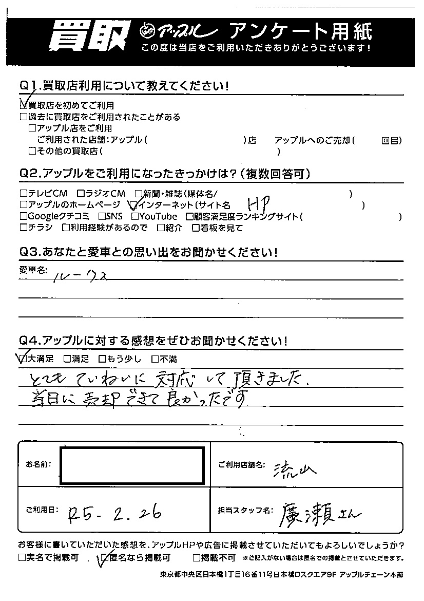 お車のご相談・ 査定だけでもOK! カンタン 入力 30秒 アップルがブランド買取始めました! お電話でも受付中! 受付時間10:00 ~ 18:30 0120-703-903 お車のご相談・ 査定だけでもOK! カンタン 入力 30秒 アップルがブランド買取始めました! お電話でも受付中! 受付時間10:00 ~ 18:30 0120-703-903 アップルがブランド買取始めました! お電話でも受付中! 受付時間10:00 ~ 18:30 0120-703-903 店舗情報 在庫車 スタッフ紹介 ブログ お客様の声 キャンペーン お得 無料査定 click お客様の声 ご記入日: 2023/02/26 S様 車名:日産 ルークス Q.アップルに対する感想をぜひお聞かせください!大満足とてもていねいに対応して頂きました。当日に売却できて良かったです。 前へ 次へ お客様の声一覧を見る