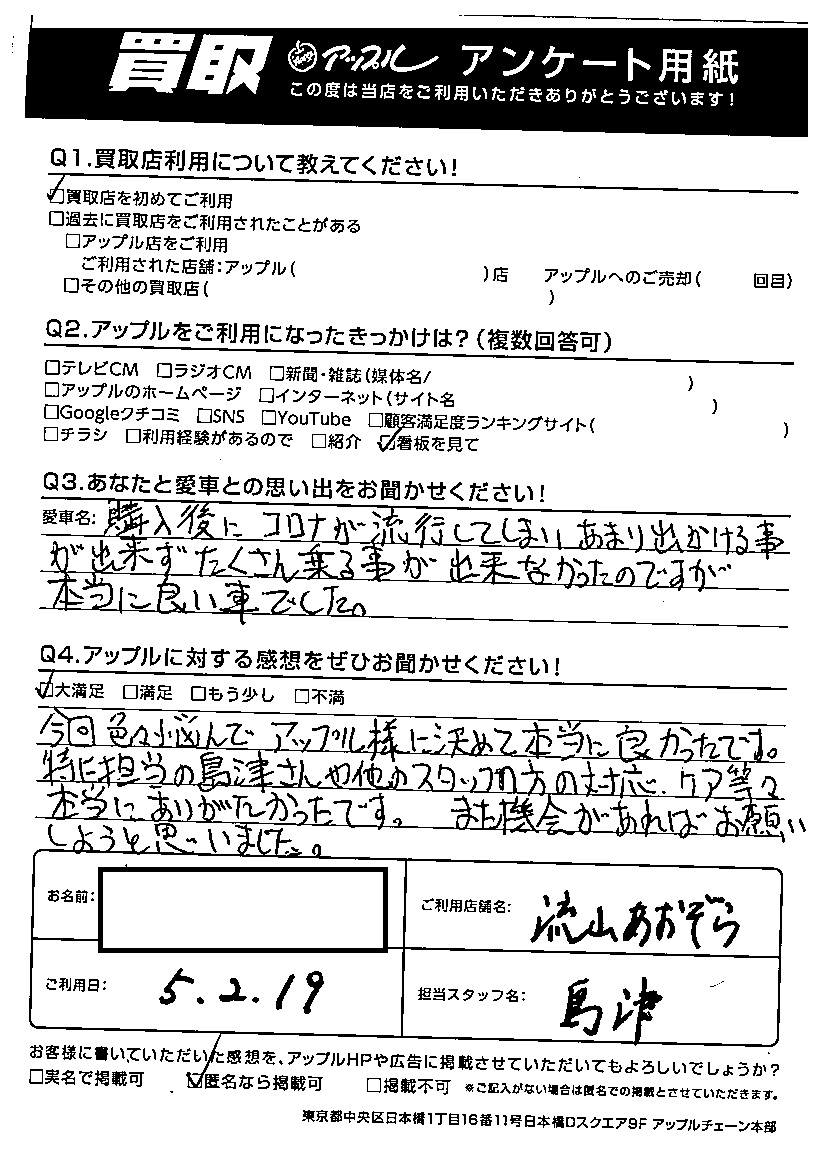 特に担当の島津さんや他のスタッフの方の対応、ケア等々本当にありがたかったです。