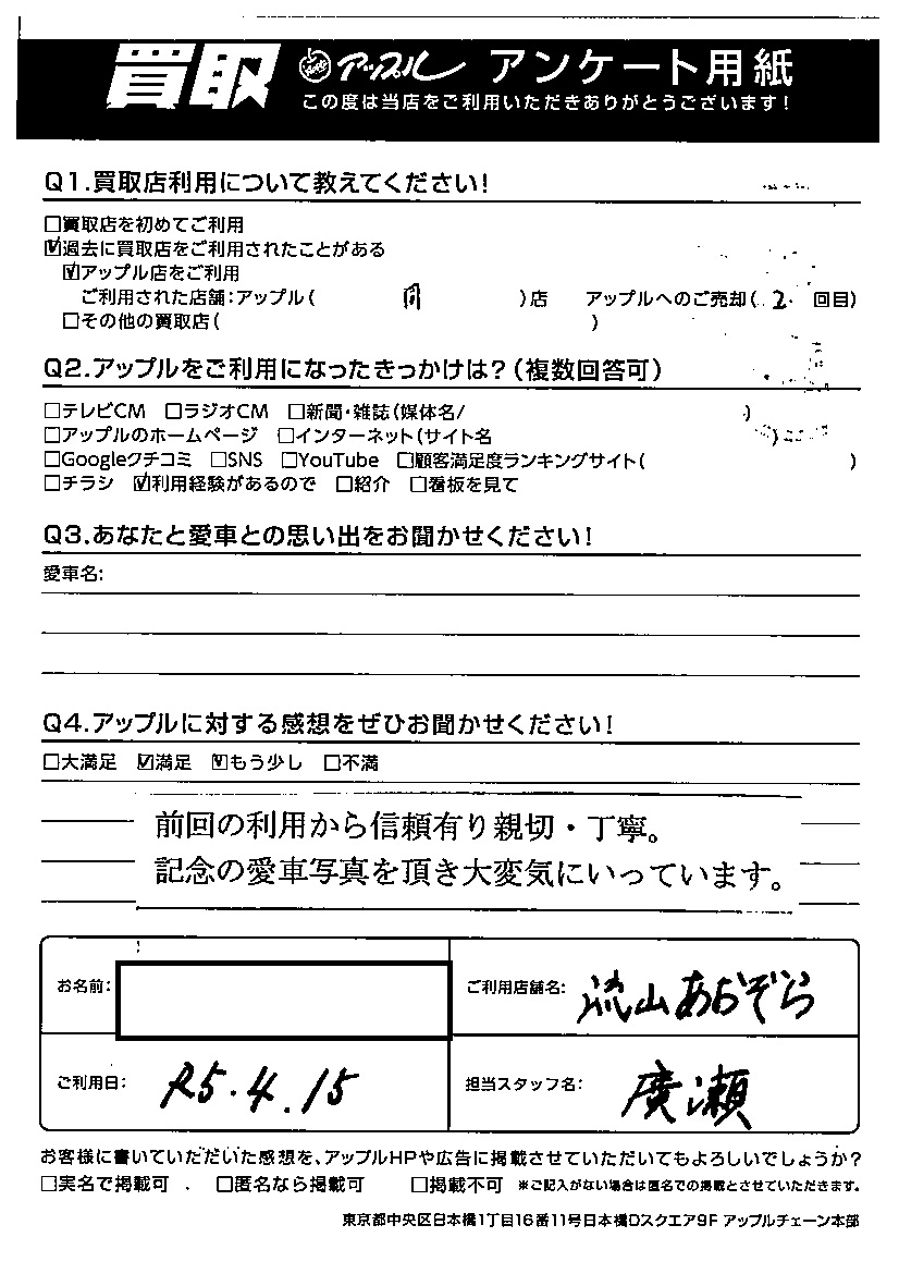 お車のご相談・ 査定だけでもOK! カンタン 入力 30秒 アップルがブランド買取始めました! お電話でも受付中! 受付時間10:00 ~ 18:30 0120-703-903 お車のご相談・ 査定だけでもOK! カンタン 入力 30秒 アップルがブランド買取始めました! お電話でも受付中! 受付時間10:00 ~ 18:30 0120-703-903 アップルがブランド買取始めました! お電話でも受付中! 受付時間10:00 ~ 18:30 0120-703-903 店舗情報 在庫車 スタッフ紹介 ブログ お客様の声 キャンペーン お得 無料査定 click お客様の声 ご記入日: 2023/04/15 T様 車名:日産 ティーダ Q.アップルに対する感想をぜひお聞かせください!満足前回の利用から信頼有り親切・丁寧。記念の愛車写真を頂き大変気にいっています。 前へ 次へ お客様の声一覧を見る