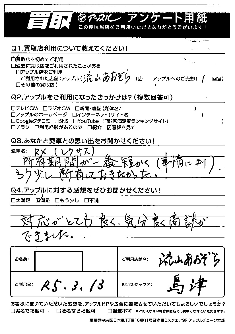 S様 車名:レクサス RX (国内仕様 右H(H27年10月~HYBRID含)