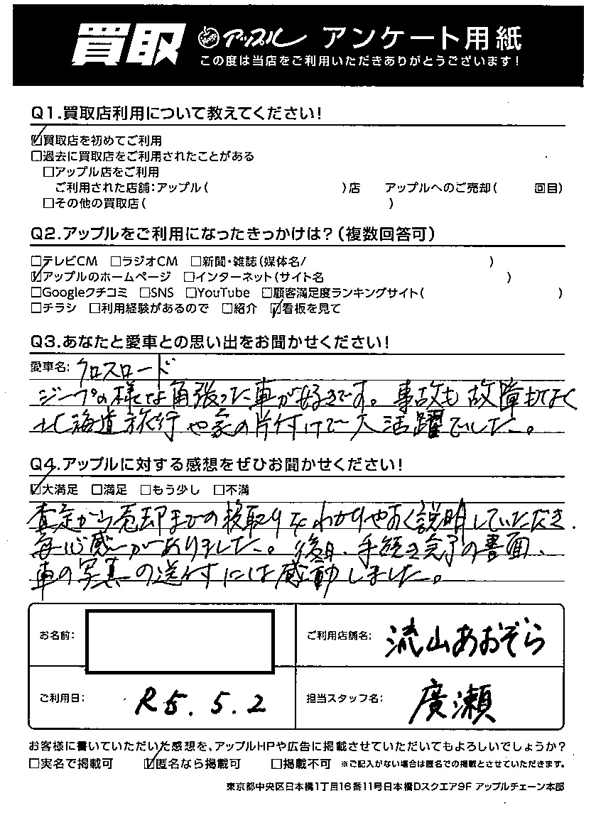査定や売却までの段取りをわかりやすく説明していただき、安心感がありました。後日、手続き完了の書面、車の写真の送付には感動しました。