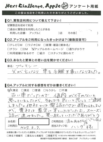 古い車だったので、値段が付かないと思っていましたが、それでも良いと思ってご連絡しました。他社では電話だけで断られましたが、貴社は査定に来ていただいた上、スムーズに話が進みました。買い取っていただきありがとうございました。