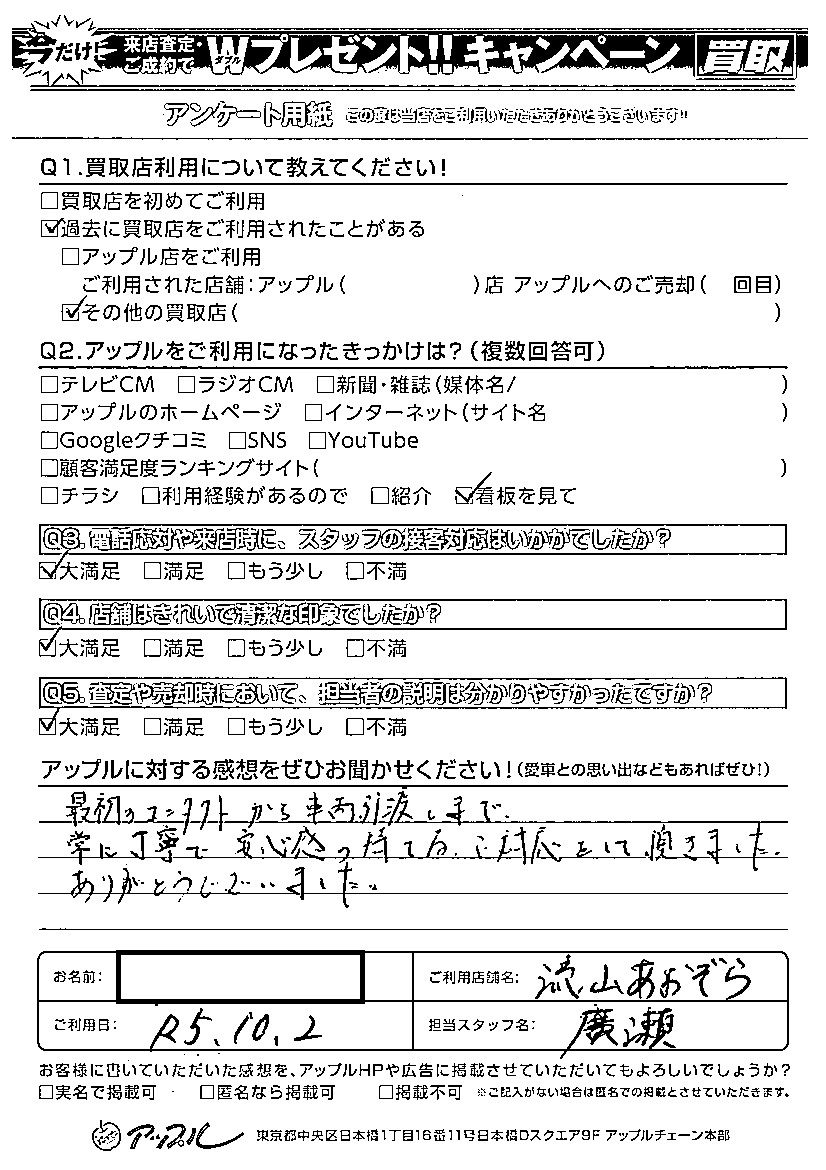 お車のご相談・ 査定だけでもOK! カンタン 入力 30秒 アップルがブランド買取始めました! お電話でも受付中! 受付時間10:00 ~ 18:30 0120-703-903 お車のご相談・ 査定だけでもOK! カンタン 入力 30秒 アップルがブランド買取始めました! お電話でも受付中! 受付時間10:00 ~ 18:30 0120-703-903 アップルがブランド買取始めました! お電話でも受付中! 受付時間10:00 ~ 18:30 0120-703-903 店舗情報 在庫車 スタッフ紹介 ブログ お客様の声 キャンペーン お得 無料査定 click お客様の声 ご記入日: 2023/10/02 M様 車名:トヨタ ヤリス Q.アップルに対する感想をぜひお聞かせください!最初のコンタクトから車両引き渡しまで常に丁寧で安心感の持てるご対応をして頂きました。ありがとうございました。 前へ 次へ お客様の声一覧を見る