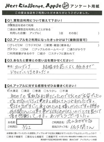 初めての買取店利用だったので行くのが不安でした。でもお店に行ってみると明るくて入りやすかったです。受付の方がすぐに来てくれたのも嬉しかったです。担当の佐久間さんには車の事が何も分からないのにとても良くして頂き感謝しています。ありがとうございました。