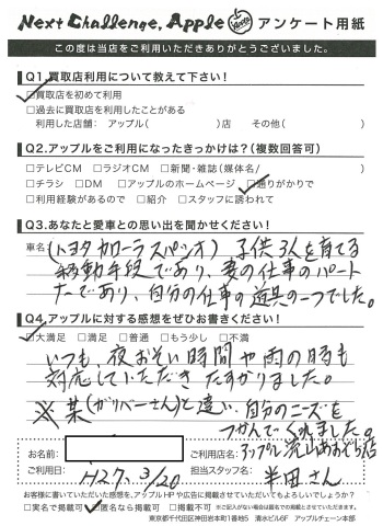 H様、アンケートへのご記入ありがとうございました!そして当店にスパシオをお任せいただきありがとうございました!