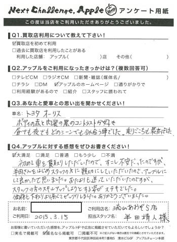 初めて車を買取りしていただいたので、少し不安だったのですが、半田さんをはじめスタッフの方に親切にしていただいたので、アップルに良かったと思いました。おたよりも送っていただいたのですが、スタッフの方のスキルアップしようとする姿がステキでした。価格も下取りより高くてビックリしました。ありがとうございました。