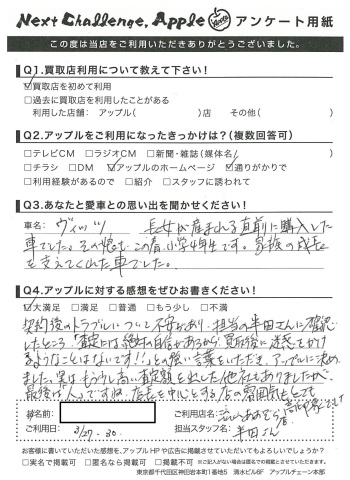 契約後のトラブルについて不安があり、担当の半田さんに確認したところ「査定には絶対の自信があるから買取後に迷惑をかけるようなことはないです!!」との強い言葉をいただき、アップルに決めました。実はもう少し高い査定額を出した他社もありましたが、最後は「人」ですね。店長を中心とする店の雰囲気もとても好印象でした。