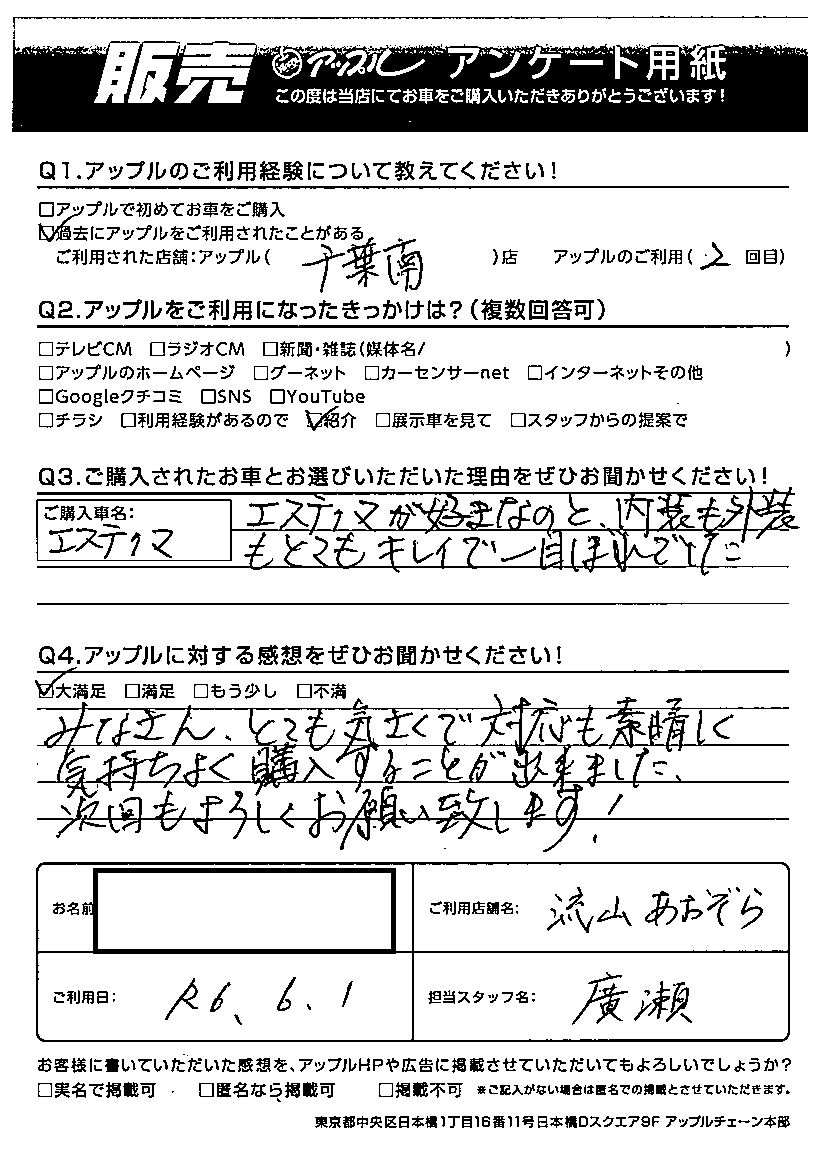 エスティマが好きなのと、内装も外装もとてもキレイで一目ぼれでした