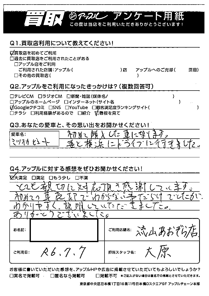 初めての車売却でわからない事だらけでしたが、わかりやすく説明していただきました。