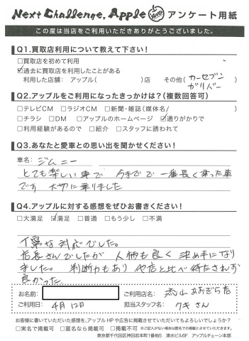 このたびはアンケートにご協力いただきありがとうございました!とてもカッコよくきまっているジムニーですからね!Y様と同じように大切に乗っていただける次のオーナー様をしっかり探します!ありがとうございました!!