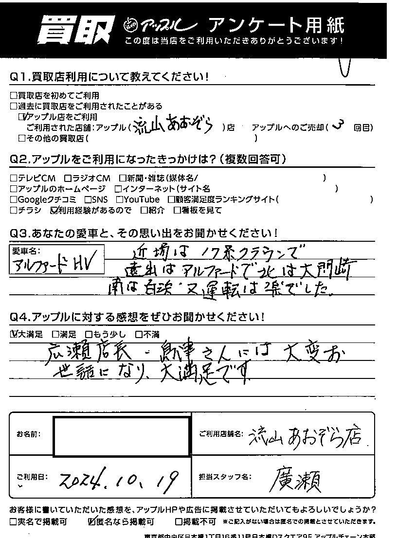 H様 車名:トヨタ アルファード(H27年1月~のHYBRID含む)