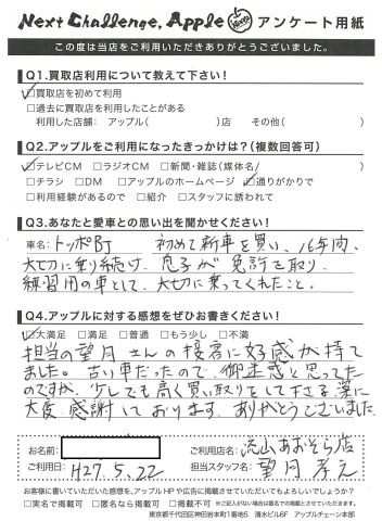 担当の望月さんの接客に好感が持てました。古い車だったので、御迷惑と思ってたのですが、少しでも高く買い取りをして下さる姿に大変感謝しております。ありがとうございました。