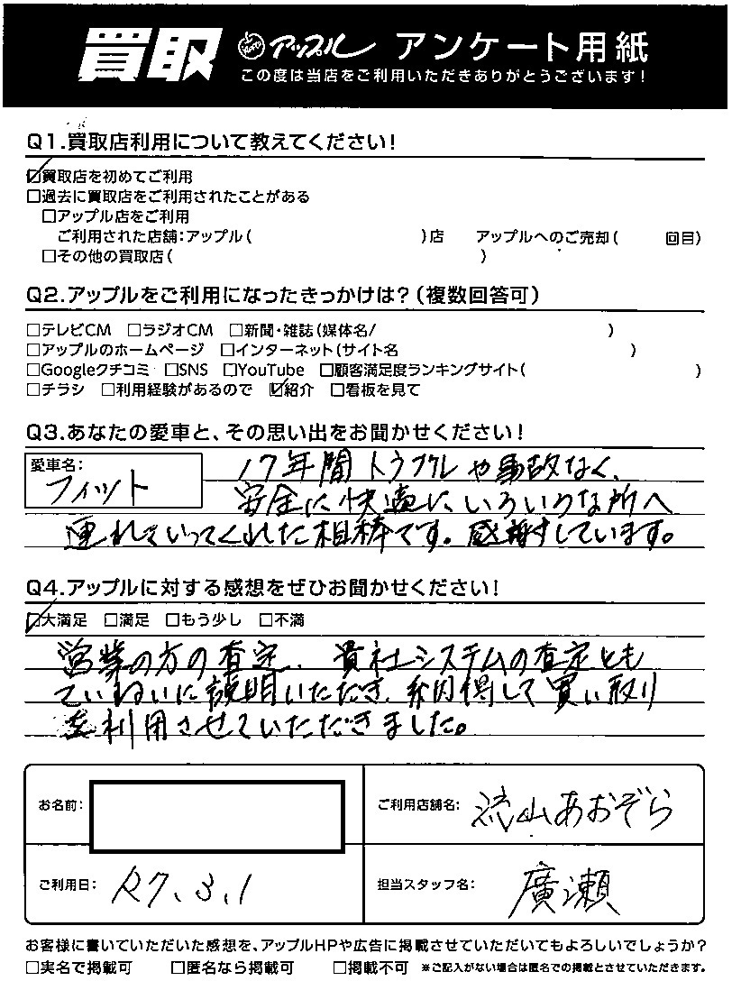 営業の方の査定、貴社システムの査定ともていねいに説明いただき、納得して買い取りを利用させていただきました。