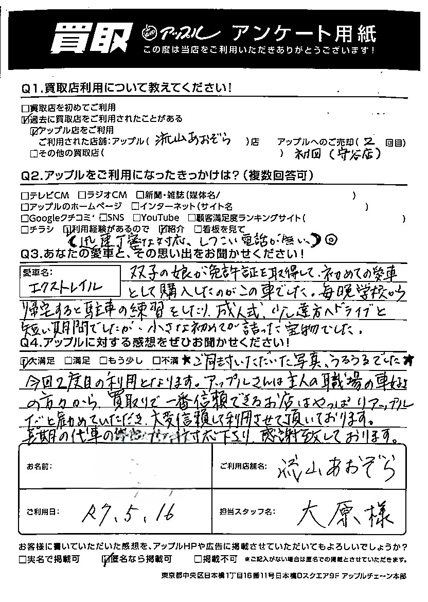 今回2度目の利用となります。アップルさんは主人の職場の車好きの方々から買取りで一番信頼できるお店はやっぱりアップルだと勧めていただき、大変信頼して利用させていただいております。