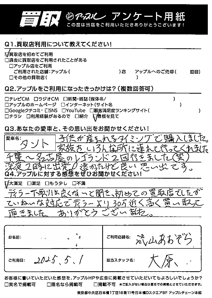 ディーラー下取りは良くないと聞き、初めての買取店でしたがていねいな対応でディーラーより30万近く買いとって頂きました。ありがとうございました。
