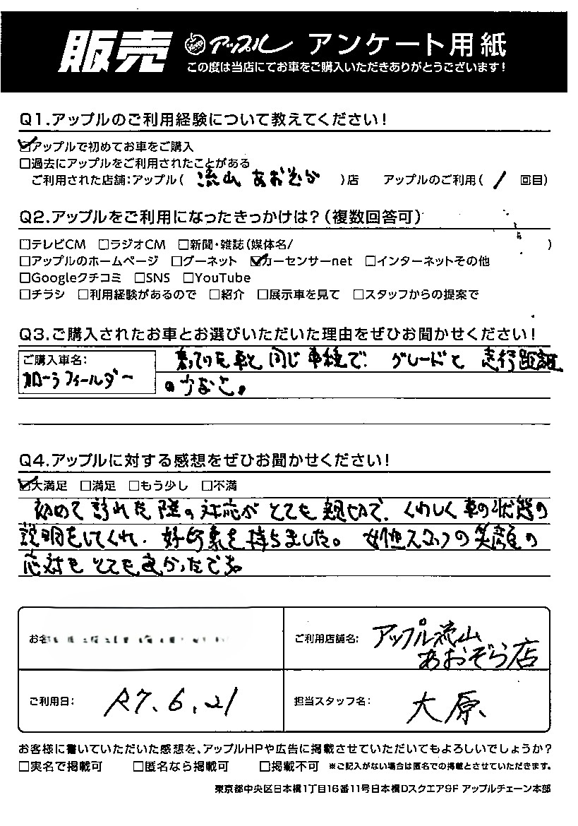 初めて訪れた時の対応がとても親切で、くわしく車の状態の説明をしてくれ、好印象を持ちました。女性スタッフの笑顔の応対もとても良かったです。
