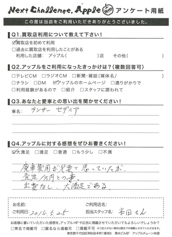 I様、このたびはアンケートにご協力いただきありがとうございます!大切に乗られてこられたお車ですからね!大切に乗られてきた思いを買取価格にしっかり反映させていただきました!また機会がありましたら、どうぞよろしくお願いいたします!!