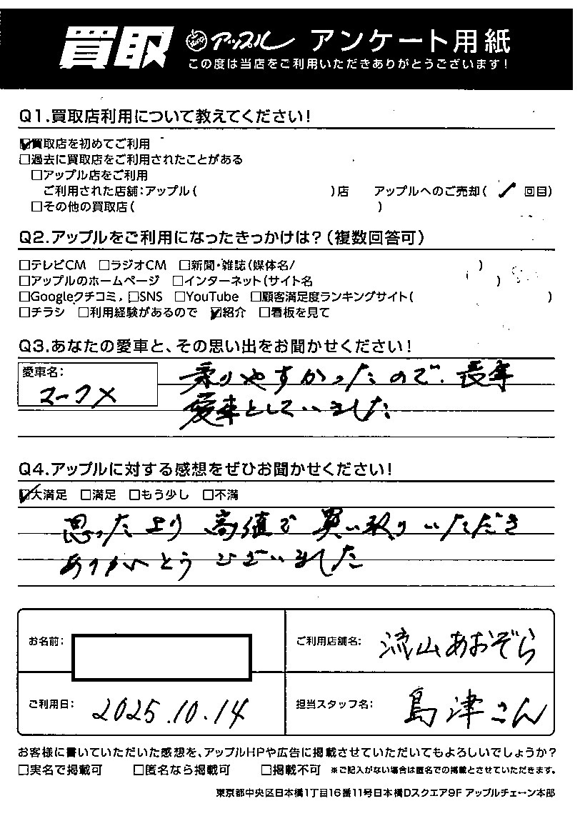 T様 車名:トヨタ マークX