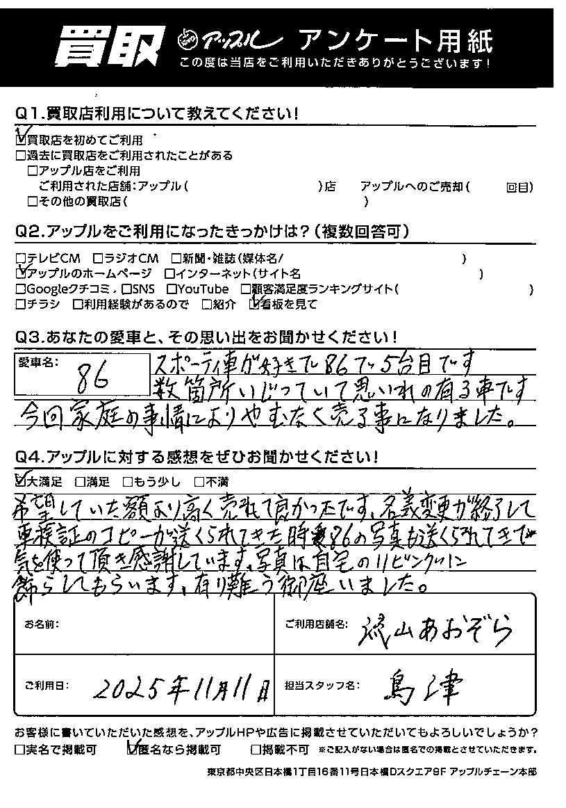 希望していた金額より高く売れて良かったです。名義変更が終了して車検証のコピーが送られてきた時、86の写真も送られてきて気をつかっていただき感謝しています。