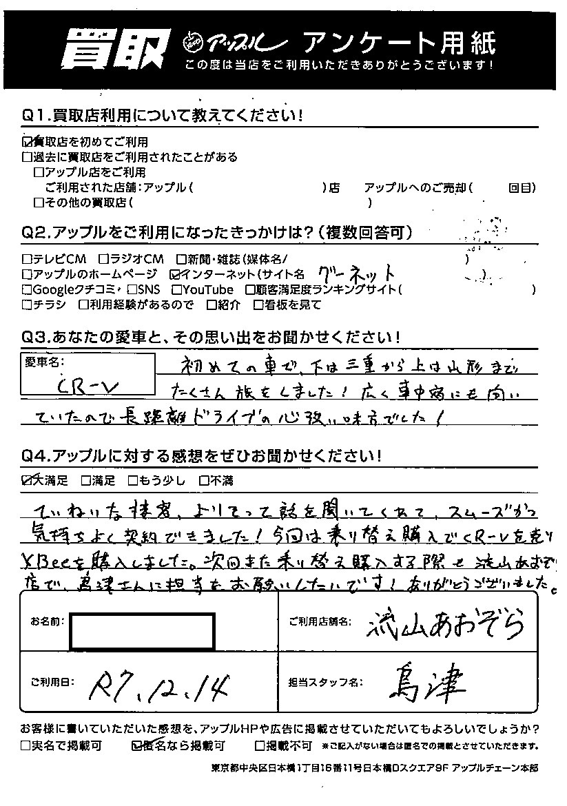 次回また乗り換え購入する際も流山あおぞら店で、島津さんに担当をお願いしたいです!