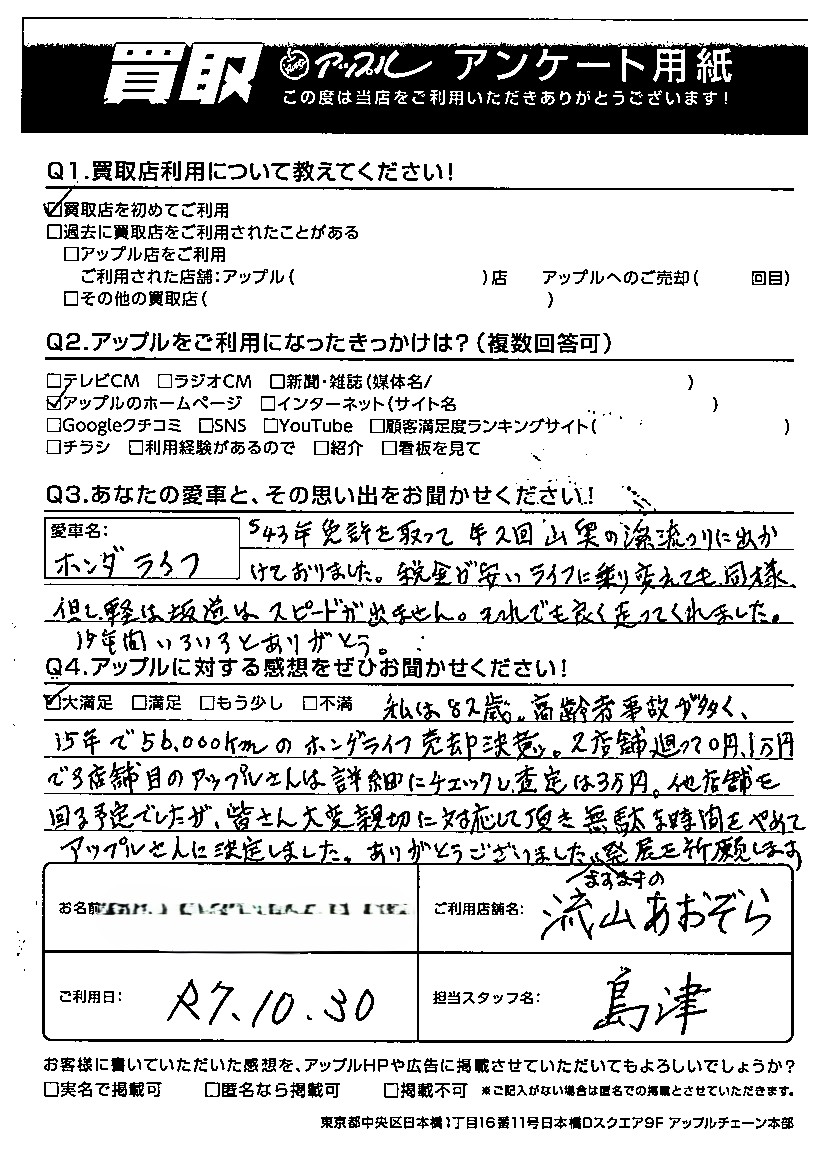 O様 車名:ホンダ ライフ