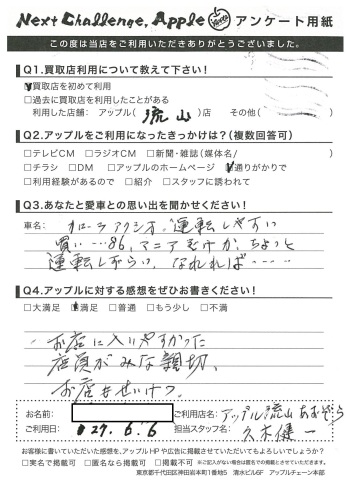 I様、アンケートにご記入いただきありがとうございました!86の納車のときのI様の子供のような笑顔がスタッフ全員忘れられません!本当にありがとうございました!byスタッフ一同