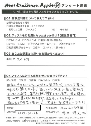 H様、アンケートのご協力をいただきありがとうございます!そしてとても嬉しいお言葉をいただき、スタッフ一同感激です!H様が大事に乗られていたからこそ、しっかりと評価をしたまでです!本当にありがとうございました~!by半田靖人