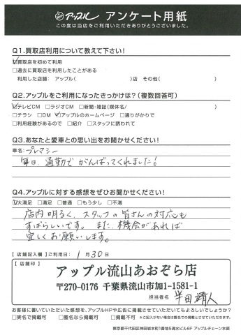 T様、このたびはアンケートにご協力いただきましてありがとうございます!!電話での応対を気に入っていただき、とても嬉しい限りで、今後の励みにもなります!これをご縁にどうぞよろしくお願いいたします!by半田靖人