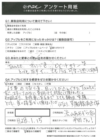 O様、このたびはアンケートにご協力いただきありがとうございます!ステキなタントと出会うことができましたね!そして、嬉しいお褒めの言葉に感激です!オレンジのタントを見かけましたら、手を振らせていただきます~by半田靖人
